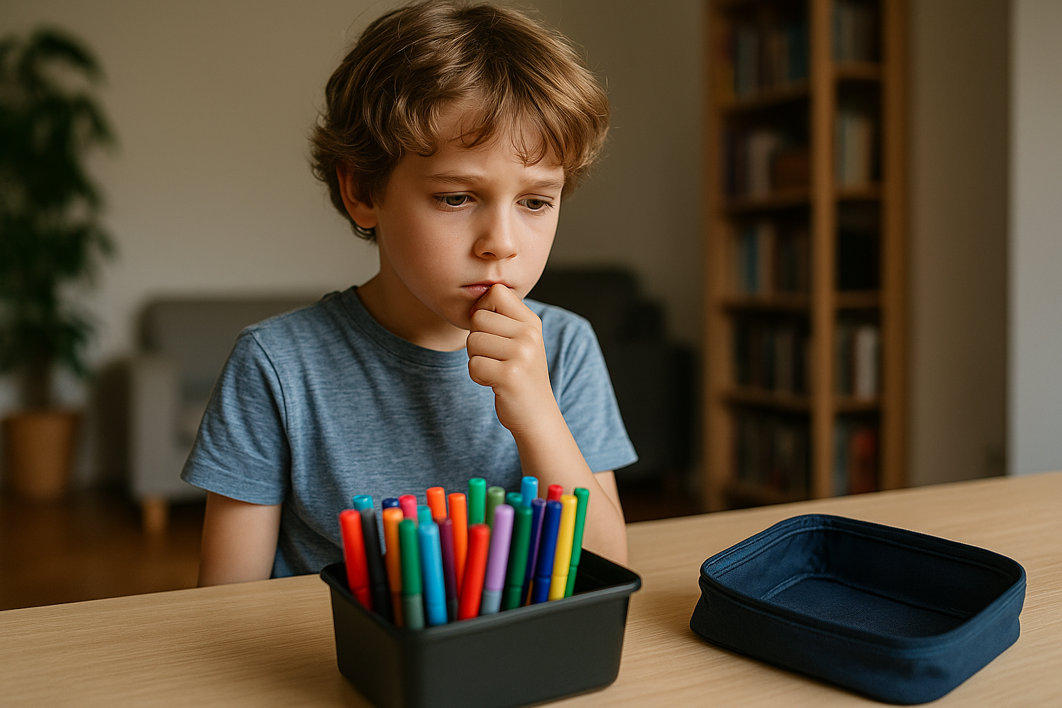Ils me racontent une situation récente pour m’expliquer le perfectionnisme de leur fils. A la maison, ils ont un grand bac rempli de feutres de toutes sortes. E part en classe verte dans les prochains jours, et il doit constituer une trousse. Les parents racontent : « Nous lui avons demandé de préparer sa trousse. Mais il est resté planté là, devant le bac, à ne rien faire. Puis il s’est énervé ».